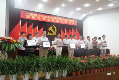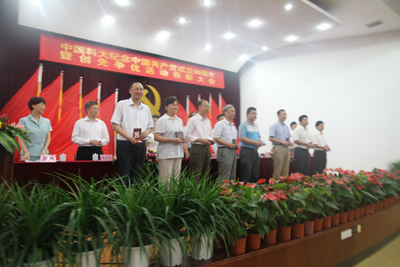 校党委副书记、副校长叶向东宣读了校党委表彰决定,授予少年班学院党总支等39个党组织“先进基层党组织”荣誉称号,授予李曙光等77名同志“优秀共产党员”荣誉称号,授予董雨等25名同志“优秀党务工作者”荣誉称号。其中,推荐少年班学院党总支等5个党组织为中国科学院“先进基层党组织”,国家同步辐射实验室党总支等4个党组织为安徽省委教育工委“先进基层党组织”;推荐李曙光等9名同志为中国科学院“优秀共产党员”,杜江峰等4名同志为安徽省委教育工委“优秀共产党员”;推荐董雨等4名同志为中国科学院“优秀党务工作者”,李凡庆等4名同志为安徽省委教育工委“优秀党务工作者”。