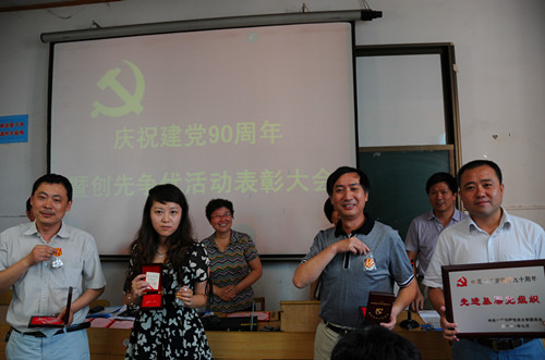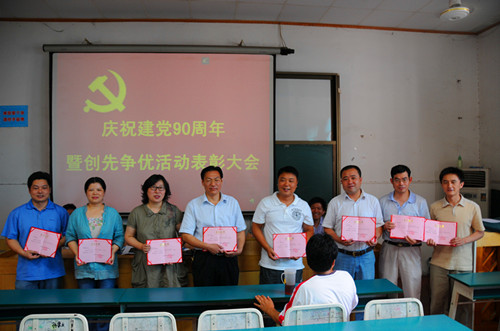 科大附中党总支于6月30日召开了纪念建党九十周年暨创先争优活动表彰大会。会议由党总支宣传委员黄乃斌主持,全体党总支委员参加了会议。按照会议议程,全体党员起立、唱国歌,党总支组织委员余国军同志宣读了科大附中党总支的表彰决定,全体总支委员为获得表彰的优秀党支部和优秀党员、优秀党务工作者颁发了获奖证书。