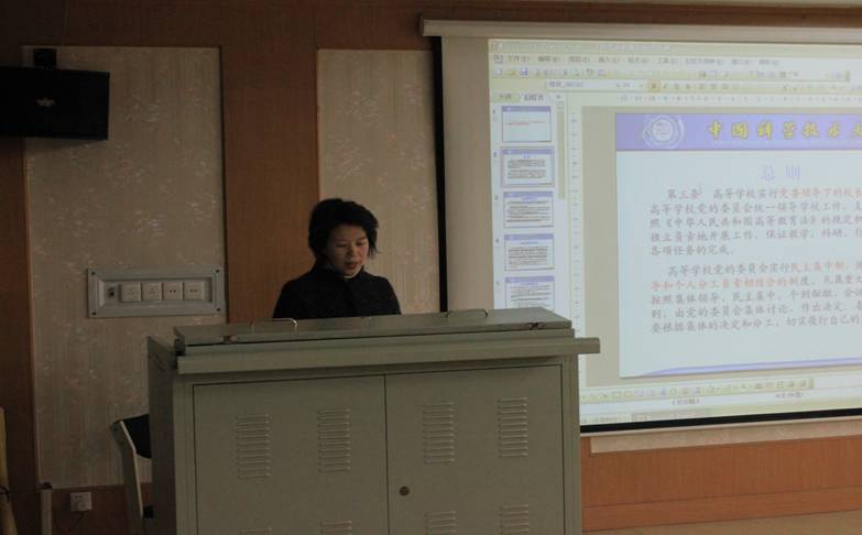 会上,丁翠平首先对《《中国共产党普通高等学校基层组织工作条例》的相关条款进行了联系实际的解读,详细介绍了高校党组织设置和党员的发展、教育和管理,重点强调了学生党支部的职责。随后,对学生党员发展工作进行了统一要求和系统培训,并详细介绍了与学生支部工作相关的党务知识。最后,就本学期学生党建工作进行了布置,希望各支部继续做好创先争优工作,认真做好党员发展工作,通过学习交流和社会实践活动不断加强支部的凝聚力,把支部建设成为引领学生刻苦学习、团结进步、健康成长的班级核心。
