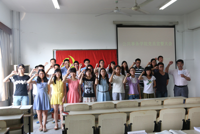 6月19日,我院在南区公共事务学院楼401教室召开2015年党员集体谈话暨宣誓大会,全院26名新发展的学生党员深入学习党章和习近平总书记系列重要讲话精神和“三严三实”要求,并按照党章规定,带领学生党员在党旗下庄严宣誓。