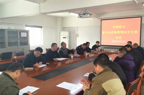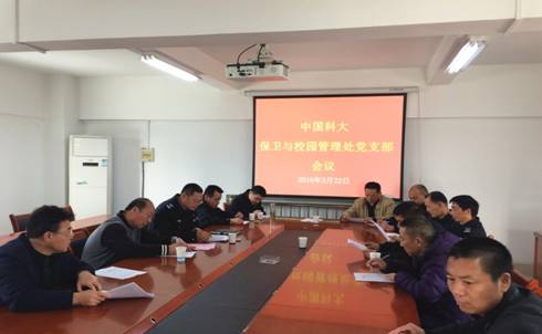 为贯彻落实许武书记在全校干部教授大会讲话精神,推进党支部工作,保卫与校园管理处于3月22日下午在学生服务中心六楼会议室召开了2016年度第一次党支部会议,共19名党员参加,会议由支部书记洪军同志主持。