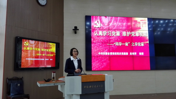 为推动学院“两学一做”学习教育的开展, 计算机学院党委5月28日下午在3117教室举办学院“两学一做”首场专题党课,邀请中共安徽省委党校党史党建部副主任、我校马克思主义学院双聘教授吴梅芳为全院师生党员作“认真学习党章维护党章权威”的专题辅导报告。全院教工党员、学生党员、入党积极分子共计260余人参加了专题党课的学习。报告会由院党委书记钱海主持。