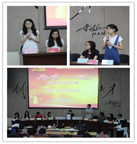 管理学院党委依托本科生党总支、研究生党总支和管理学院分团委,经过近一个月的筹备,在全体学生党员中组织开展了“两学一做”学习教育知识竞赛,以学促竞、以竞促学。活动部署以来,所有学员积极参与,通过自学、专题讨论、交流体会等形式进行了知识储备。竞赛分为初赛、复赛和决赛三个阶段。初赛由各学生党支部自行组织,并推荐至少3名党员组成代表队参加复赛;复赛采取书面知识竞赛的形式,并选拔4支代表队进入决赛,比赛采取积分制,得分高者胜出。