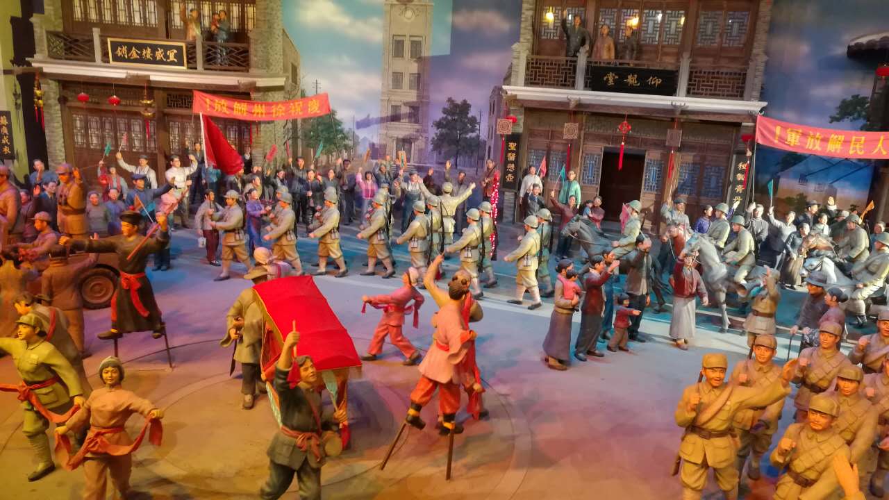 接着参观了淮海战役纪念馆新馆。新馆建筑面积2.56万平方米,共展出文物、照片、图表近3000件,复原场景9个。全景画《淮海战役》运用油画、地面塑型、声光电多媒体技术配合旋转观景平台,展现了淮海战役规模宏大、战场辽阔、战斗激烈、人民支前规模空前的不朽画卷。