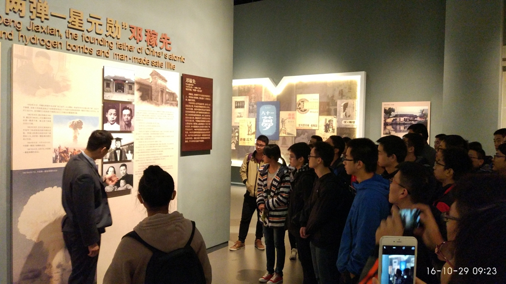 同学们先参观了安徽名人馆。进入馆内,首先映入眼帘的是一座刻着许多安徽名人雕像的巨型浮雕群。雕像雄伟庄重,让人不禁产生敬畏之情。大家跟随讲解员一起开启了这次的“名人之旅”。从远古的有巢氏、到春秋战国的诸子百家、再到铁路先驱詹天佑……同学们沿历史的长河,追寻着先贤的足迹。当大家走到我党创始人之一陈独秀的雕像前时,讲解员重点讲解了陈独秀充满激情和传奇的一生,大家对我党早期艰难曲折的发展历程有了深刻的体会,也对这位勇往直前的革命先驱充满了景仰之情。当讲到两弹一星元勋邓稼先时,所有同学都停下了脚步。这位伟大的科学家放弃了在美国优越的生活,放弃了与妻子、家人团聚的机会,毅然投身于两弹一星工程中,为我国科技事业发展作出了不可磨灭的贡献。
