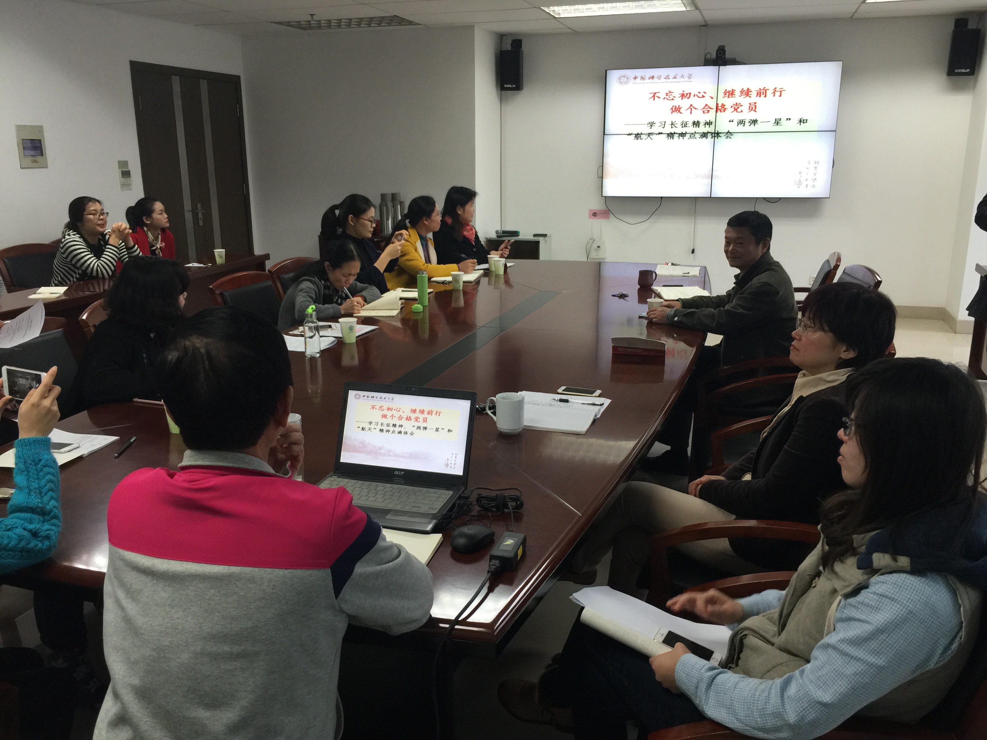 学院老党员邓国华老师做了题为“不忘初心,继续前行,做个合格党员—学习长征精神、两弹一星和航天精神点滴体会”主题报告,他带领大家学习习近平总书记关于长征精神的讲话,并图文并茂的简要回顾了长征历程,接着结合我校建校历史,给在座党员解读了“两弹一星”和航天精神,他最后结合习近平总书记考察我校重要讲话精神,阐述和解读了科大精神。作为一名老党员,邓国华的讲座充满了激情和对党的热爱忠诚,在讲座开始之前,他向大家展示了今年校党委向他颁发的纪念中国共产党建党95周年“光荣在党50年”纪念章。
