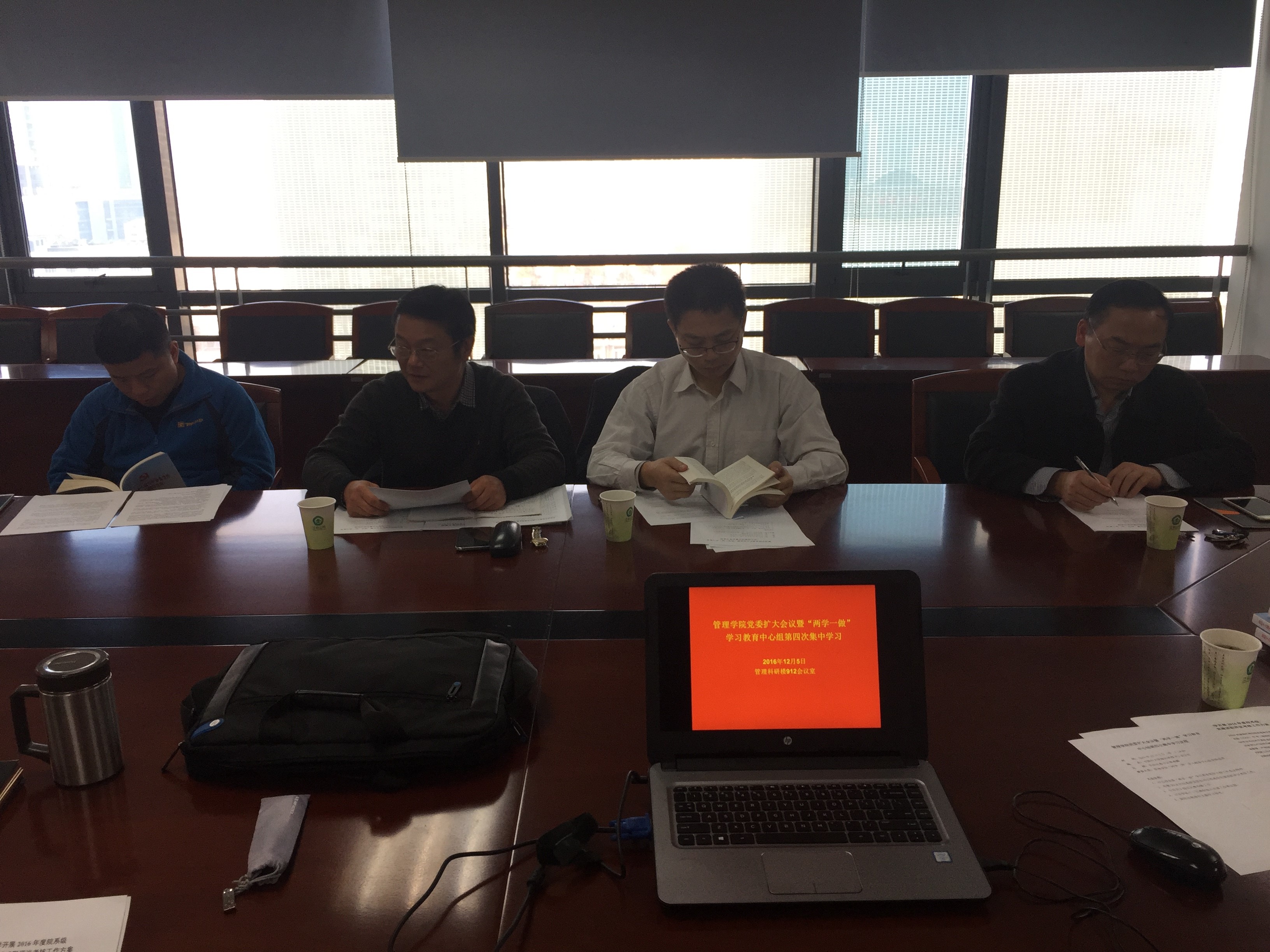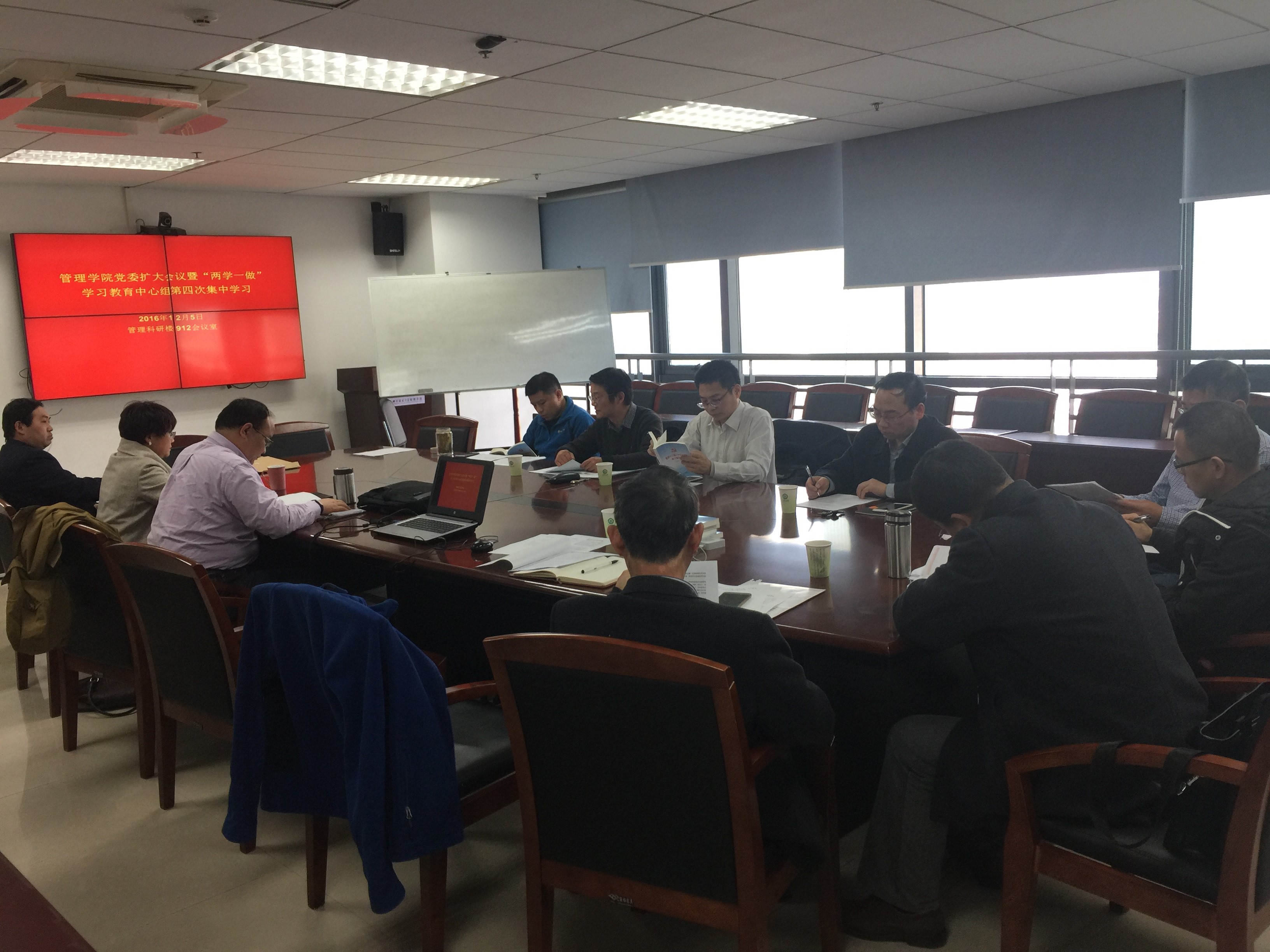 2016年12月5日下午,管理学院在管理科研楼912会议室召开学院党委扩大会议暨“两学一做”学习教育中心组第四次集中学习。学院党政领导、各党总支书记、各教工党支部书记、各系(党员)主任或副主任参加了学习,学院党委副书记芮锋主持会议。