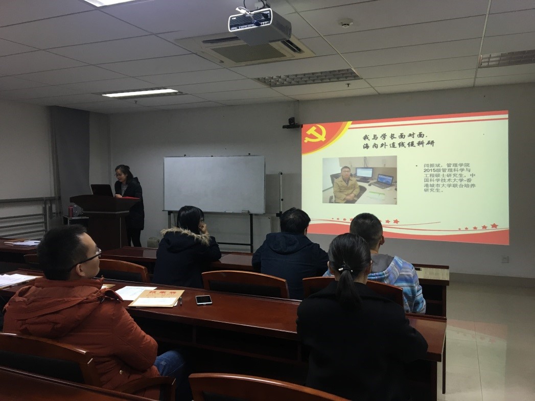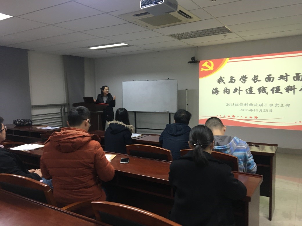 10月28日晚,管理学院2015级管科物流硕士班党支部在管理科研楼801会议室开展了主题党日活动—“我与学长面对面,海内外连线促科研”视频交流会。
