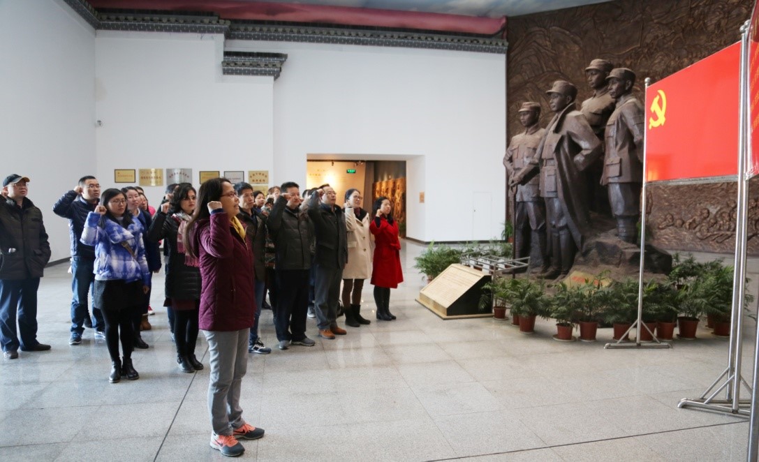 在“新四军史料陈列馆”,全体党员面对鲜红、炽热的党旗庄严宣誓,重温入党誓词,集体回顾入党时的激情与自豪,感受入党时的坚定决心,铭记宣誓时的庄严承诺,并向革命先烈表示深切怀念和崇高敬意。