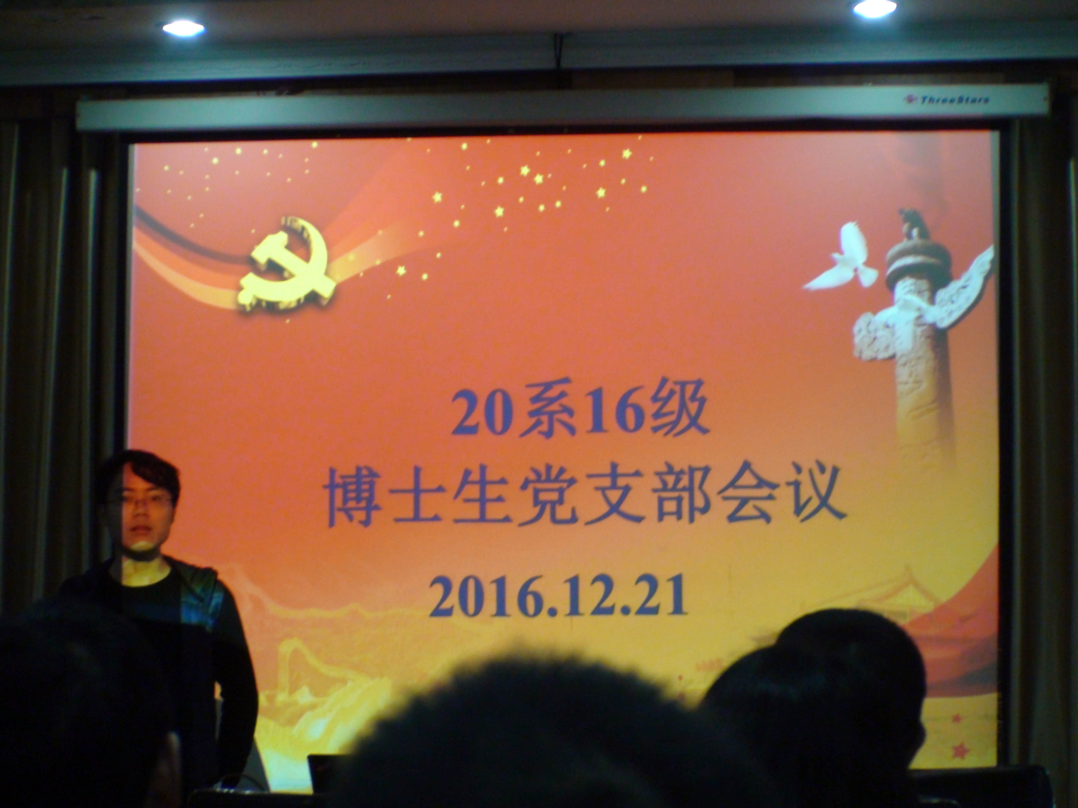 2016年12月21日晚上18:30,高分子科学与工程系16级博士生党支部在化学院材料楼5楼会议室召开了党支部大会,支部全体党员、预备党员以及部分积极分子参加了本次会议。高分子科学与工程系党总支何卫东老师出席了本次会议。会议的主要议题是预备党员转正,接收入党积极分子以及进行“两学一做”民主评议。本次会议由支部书记崔民心同学主持召开。