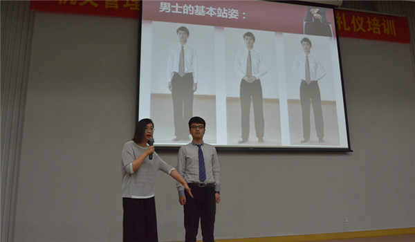 纳米科学技术学院郭云老师引经据典,为大家介绍了仪态、仪容、仪表、仪礼等商务礼仪知识。她通过PPT图片展示和请同学上台示范的方式,生动细致地展示了男女士正确的站姿、坐姿、走姿、蹲姿和仪容仪表,以及如何去训练。郭老师介绍了正确的握手方式、拥抱礼仪、会面礼仪、鼓掌礼仪等,令在场师生受益匪浅。