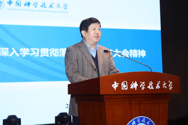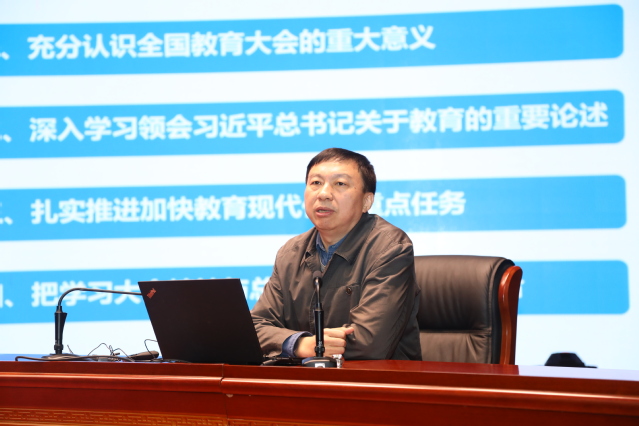 舒歌群以《深入学习贯彻落实全国教育大会精神》为题,从“充分认识全国教育大会的重大意义”、“深入学习领会习近平总书记关于教育的重要论述”、“扎实推进加快教育现代化的重点任务”、“把学习教育大会精神与学习贯彻总书记关于科大发展的系列指示精神相结合”四个方面,以详实的数据、丰富的事例展开报告,结合历史与现实的对比、中外教育发展和创新实力的对比,详细解读了全国教育大会精神,并就贯彻落实全国教育大会精神、潜心立德育人提出了明确要求。