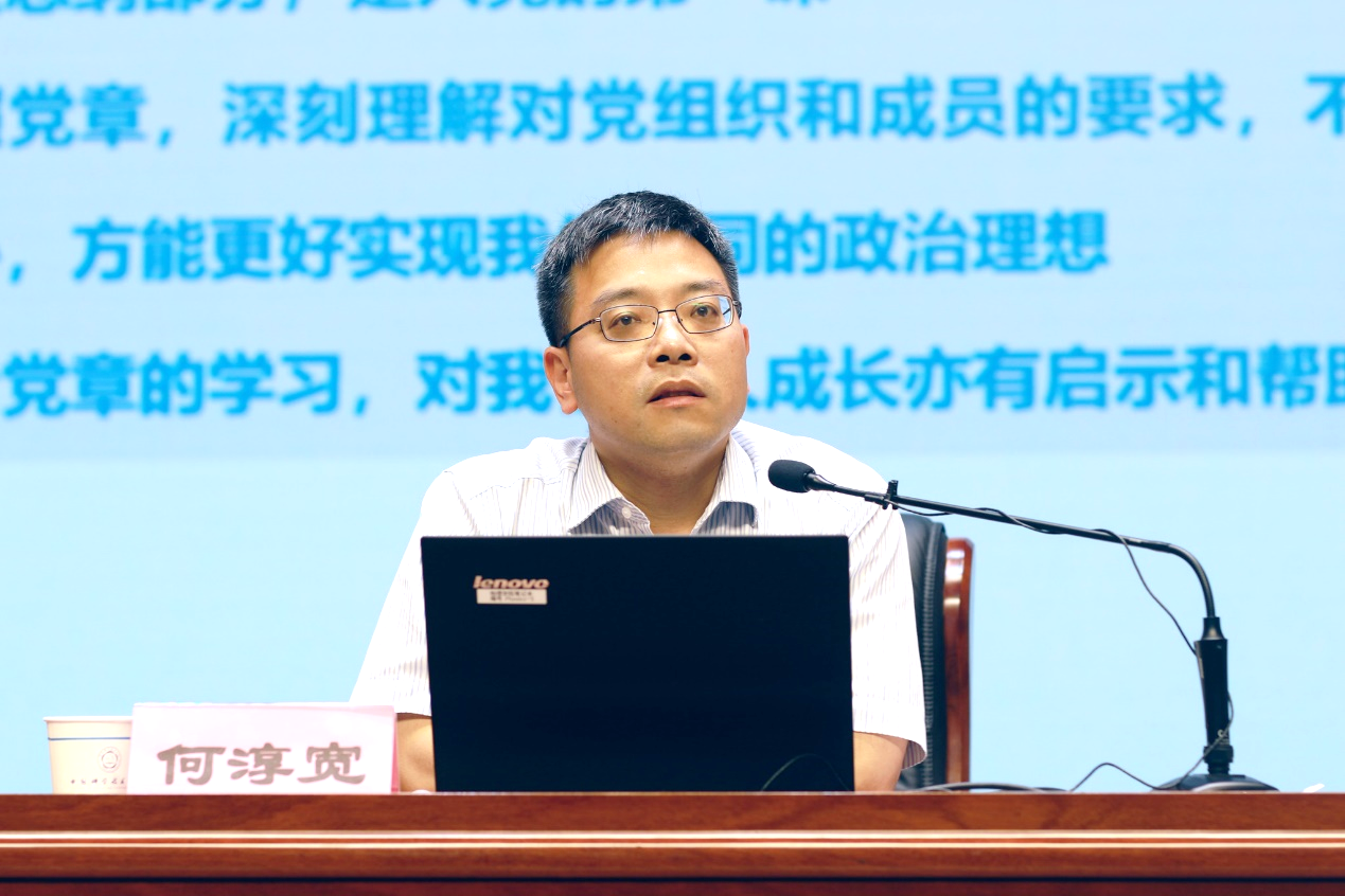 何淳宽以《共同学习党章》为题,从“党的纲领、为谁执政、服务人民对美好生活的向往、做好中国的事关键在党,入党意味着自律、更高标准、更严要求”五个方面,与学员们分享了对党章的学习体会和认识。他还结合当前社会发展、学校实际和个人成长启示,引导和教育同学们要端正入党动机和态度,增强自我革新的勇气和能力;要带头活跃班级氛围,丰富校园文化;要牢固树立“四个意识”,坚定“四个自信”,做到“两个维护”;要始终坚持自律,从严自我要求;秉承科大红专并进、科教报国的传统,强化责任担当,为祖国和人民尽一份自己应有的责任。