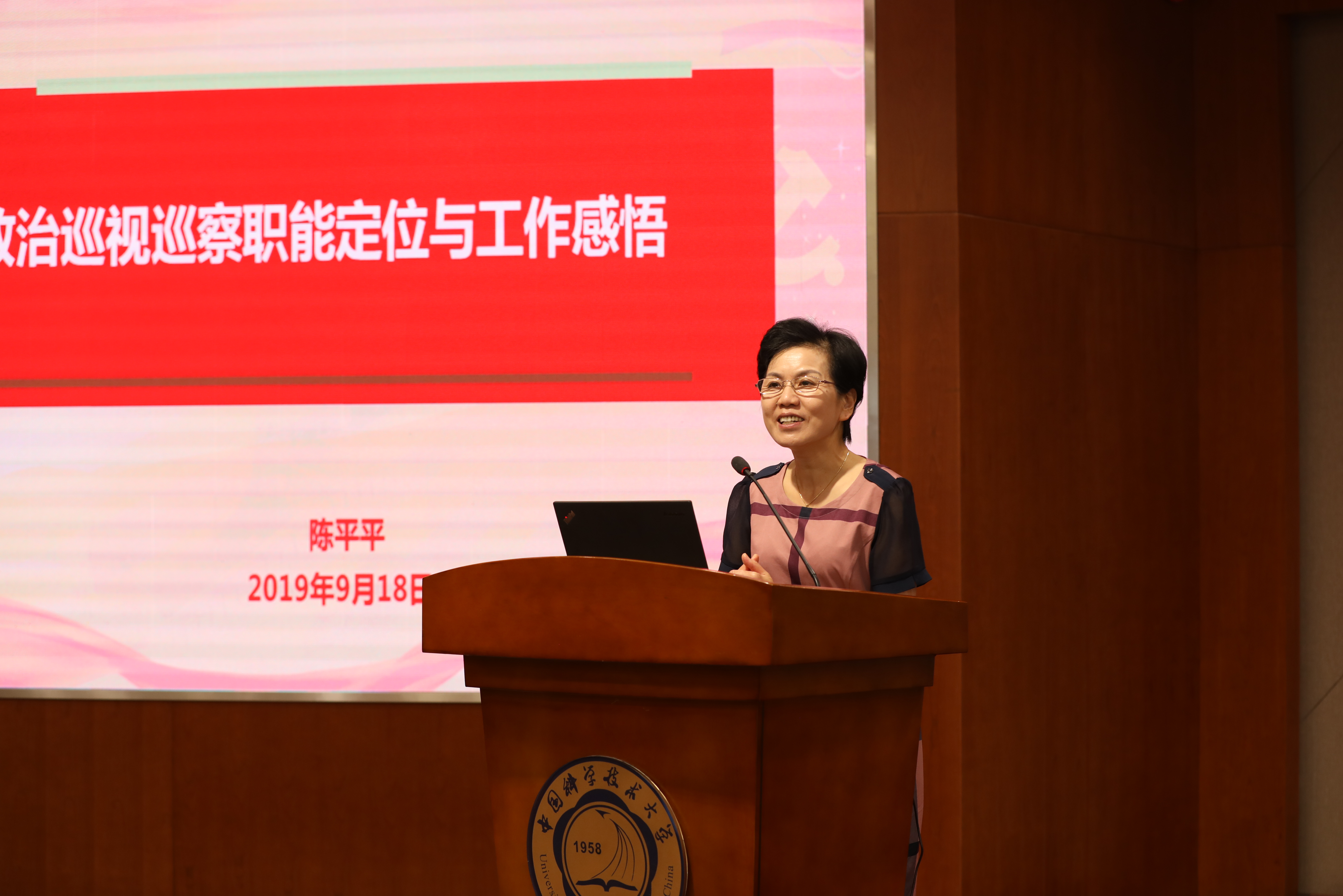 陈平平做了题为《政治巡视巡察职能定位和工作感悟》的专题报告。她围绕“为什么要开展政治巡视”“政治巡视巡什么”“政治巡视中发现哪些主要问题”“政治巡视给我们的警示和启示是什么”四个问题展开,传达了十九届中央关于政治巡视的职能定位与工作要求;结合中科院巡视经验,聚焦“六个围绕,一个加强”,解读了政治巡视巡察重点工作和中科院巡视中发现的共性问题;揭示了巡视巡察发现问题带给我们的警示和启示。她指出,要深刻认识到,巡视巡察与被巡单位是利益共同体,巡视巡察是政治体检,出发点和目的是为了堵塞漏洞、完善制度,促进改革和发展。要正确处理好党委与行政班子的关系、科研领域“放管服”与严明纪律规矩的关系、决策与执行的关系、主体责任与监督责任的关系、党委与党支部的关系,提前防范问题,及时解决问题,通过巡视巡察促进单位健康持续发展。