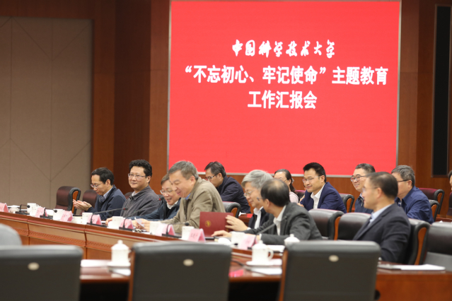 会上,舒歌群代表校党委作中国科大“不忘初心、牢记使命”主题教育工作进展情况报告。他指出,中国科大党委把主题教育与贯彻落实习近平总书记关于中国科大系列重要指示精神紧密结合,与推进“双一流”大学建设紧密结合,组织了丰富多样的教育形式,扎实开展理论学习,深入基层实地调研、指导主题教育开展,广泛听取意见建议,深刻检视问题、分析找准差距,认真落实整改清单。通过扎实开展主题教育,全校党员师生在理论学习、思政教育、责任担当、为民服务、保持清正廉洁等方面受到了深刻的教育和思想的提升,对落实习近平总书记关于中国科大系列重要指示精神,推进整改工作取得了一定的成效。