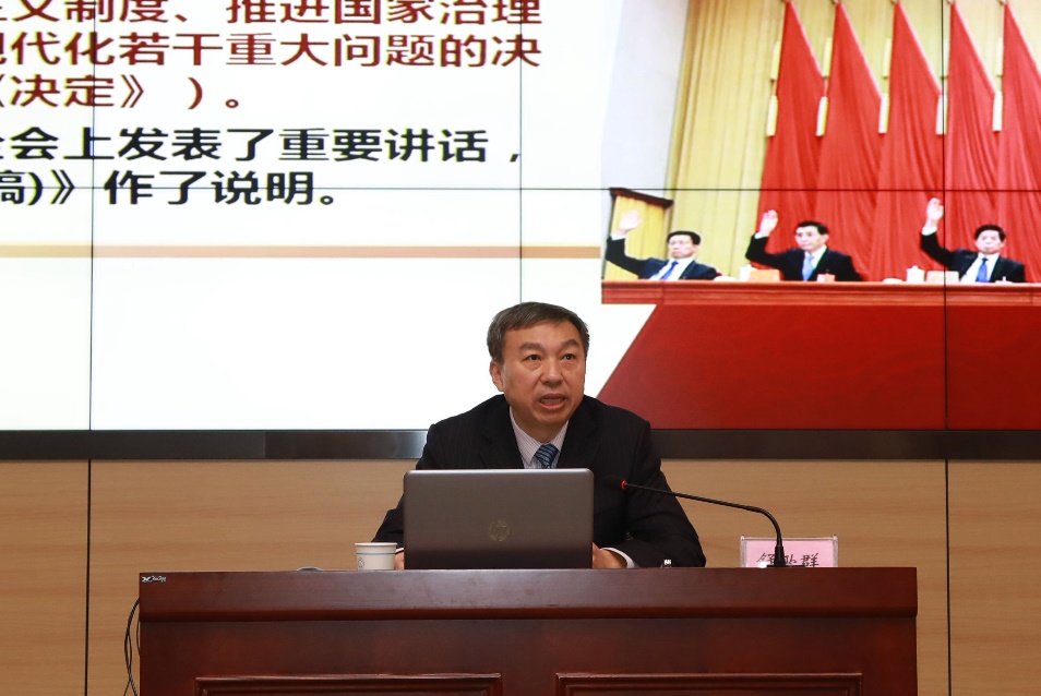 舒歌群首先带领大家回顾了十九届四中全会召开的基本情况、重大意义和全会《决定》的主要内容。党的十九届四中全会是在庆祝中华人民共和国成立70周年之际、在“两个一百年”奋斗目标历史交汇点上召开的一次具有开创性、里程碑意义的重要会议。全会专题研究坚持和完善中国特色社会主义制度、推进国家治理体系和治理能力现代化问题,全会通过的《决定》从党和国家事业发展的全局和长远出发,深入回答了“坚持和巩固什么、完善和发展什么”这个重大政治问题,既阐明了必须牢牢坚持的重大制度和原则,又部署了推进制度建设的重大任务和举措,具有重大而深远的意义。