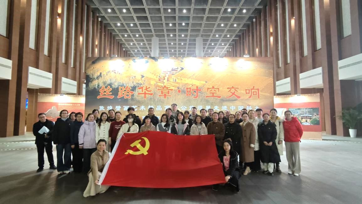 活动最后,全体党员一同参观了“丝路华章 时空交响”敦煌壁画艺术精品高校巡展。在学生讲解员的细致解说下,大家领略了敦煌壁画跨越千年的艺术魅力,深入了解了壁画背后丰厚的历史文化内涵,在美的享受与艺术熏陶中进一步增强了民族自豪感和文化认同。